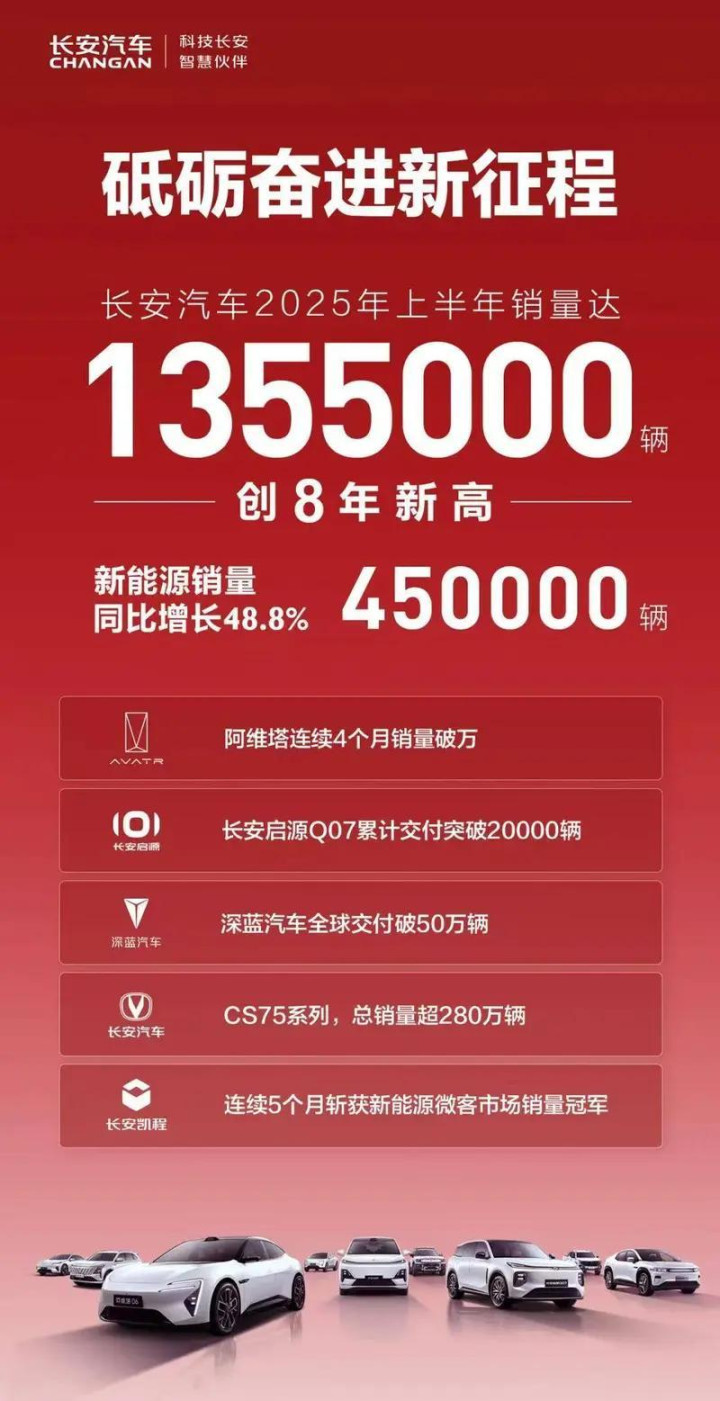扎根拥有163年历史的民族品牌长安汽车,新集团承载战略升级使命。2025年上半年业绩亮眼:整体营收1469亿元,整车产销135.5万辆创八年新高,其中新能源车销量45.2万辆(同比增49.1%),海外销量29.9万辆(同比增5.1%)。集团明确2030年目标:产销突破500万辆,新能源占比超60%,海外销量占比超30%,全力冲击全球汽车品牌前十强。